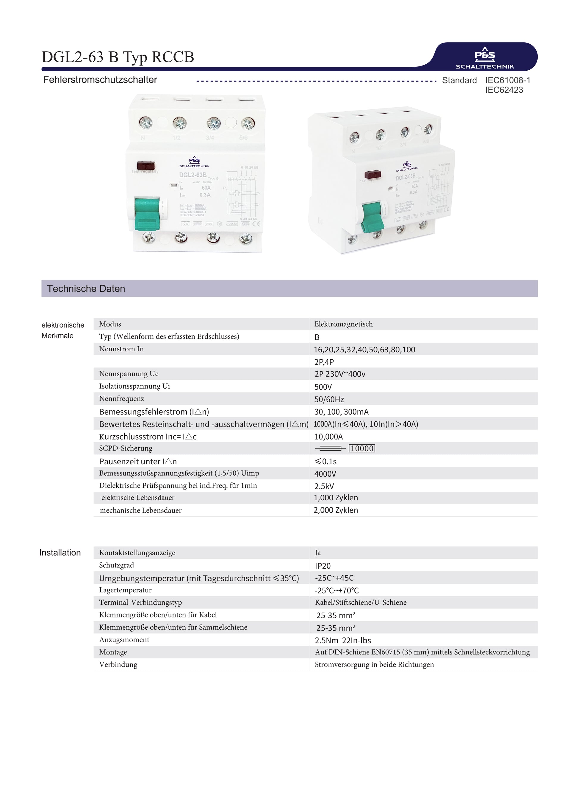 Technische Daten FI Schutzschalter Typ B 40A 30mA 2-polig – DEKRA geprüft