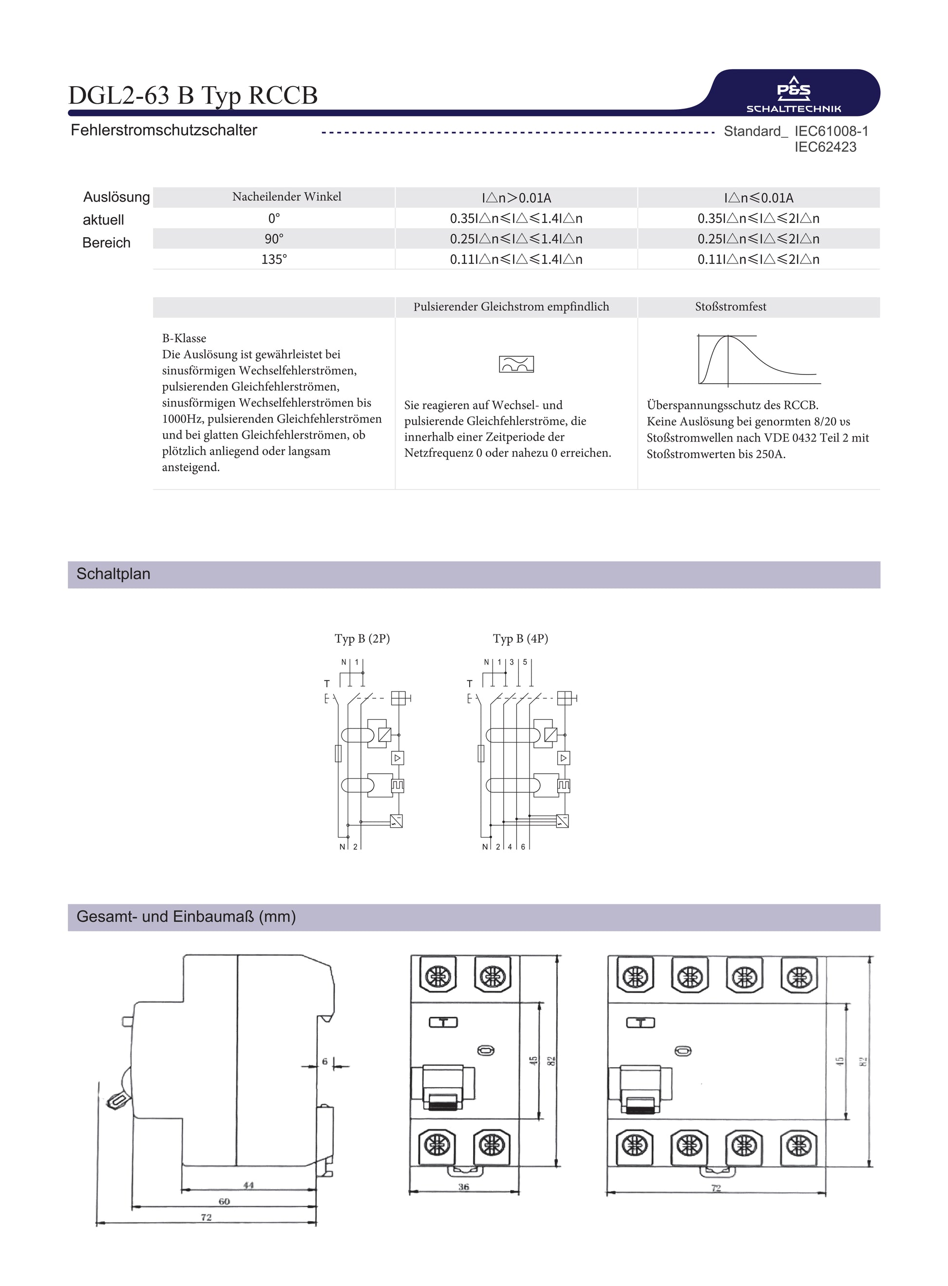 Technische Daten FI Schutzschalter Typ B 63A 300mA 4-polig – DEKRA geprüft